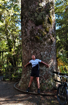 Für den Morgen hatte ich mich schon am Vorabend mit Renata und Neal zum Frühstück verabredet. Wiederholt bekam ich das Spezialmüsli meiner Gastgeberin mit unheimlich vielen gesunden Komponenten drin. Der Orangensaft natürlich frischgepresst vom Obst der Bäume aus dem eigenen Garten. Neal hatte mir vorgeschlagen für meine heutige Weiterreise Anschubhilfe zu leisten. Nicht sehr weit weg gibt es ein Naturschutzgebiet mit Kauribäumen, was zur Zeit der Besiedelung von den Holzfällern nicht angetastet wurde. Packtaschen im Kofferraum und Rennstahl am Ständer hinten, fuhren wir gemeinsam zu dem Touristenhotspot des NZ Nordens. Neal als Vorsitzender des örtlichen Rotary-Club erzählte mir, dass der Verein auch die Fallenbejagung auf die Feinde der bodenlebenden nativen Vogelwelt in dem Gebiet unterstützt. Ein rollstuhlgeeigneter Rundweg über Bohlen, führt durch diese Giganten der Pflanzenwelt. Auch oder gerade im Verbund mit den anderen heimischen Pflanzen und Bäumen ein Erlebnis.