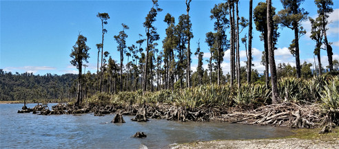 Kleines Häuschen im Grünen oder Wohnen in Kiwiland. Als nächstes Tagesziel hatte ich für heute, das Touristenmagnet Franz Josef am gleichnamigen Gletscher angepeilt. Recht entspannte 66 Kilometer, 370 Höhenmeter und 3,5 Std. theoretische Fahrzeit hatte mir Frau Google für die Tagesstrecke vorhergesagt. Bei blauen Himmel und Temperaturen bis 20 Grad radelte ich, mich an der weiten Landschaft erfreuend, drauf los. Die entspannte Atmosphäre hielt ca. 10 Minuten, bis mich ein Pickup mit Schlauchboot und weiterer Freizeitbeladung überholte. Ich fuhr aus "Sicherheitsgründen" annähernd in der Fahrbahnmitte als er mich wegen dem Gegenverkehr ohne die Mittellinie anzutasten aber mit highspeed überholte. Herzlichen Glückwunsch an den unbekannten motorisierten Performens-Künstler oder willkommen im neuseeländischen Pedelec-Paradiese. Letzterer Begriff ist Titel eines hiesigen Fahrradreiseführers und in Deutschland würde ich einen derartigen Fahrer als rücksichtslosen Idioten bezeichnen. Aber schließlich fährt man ja nicht zum Vergnügen!?